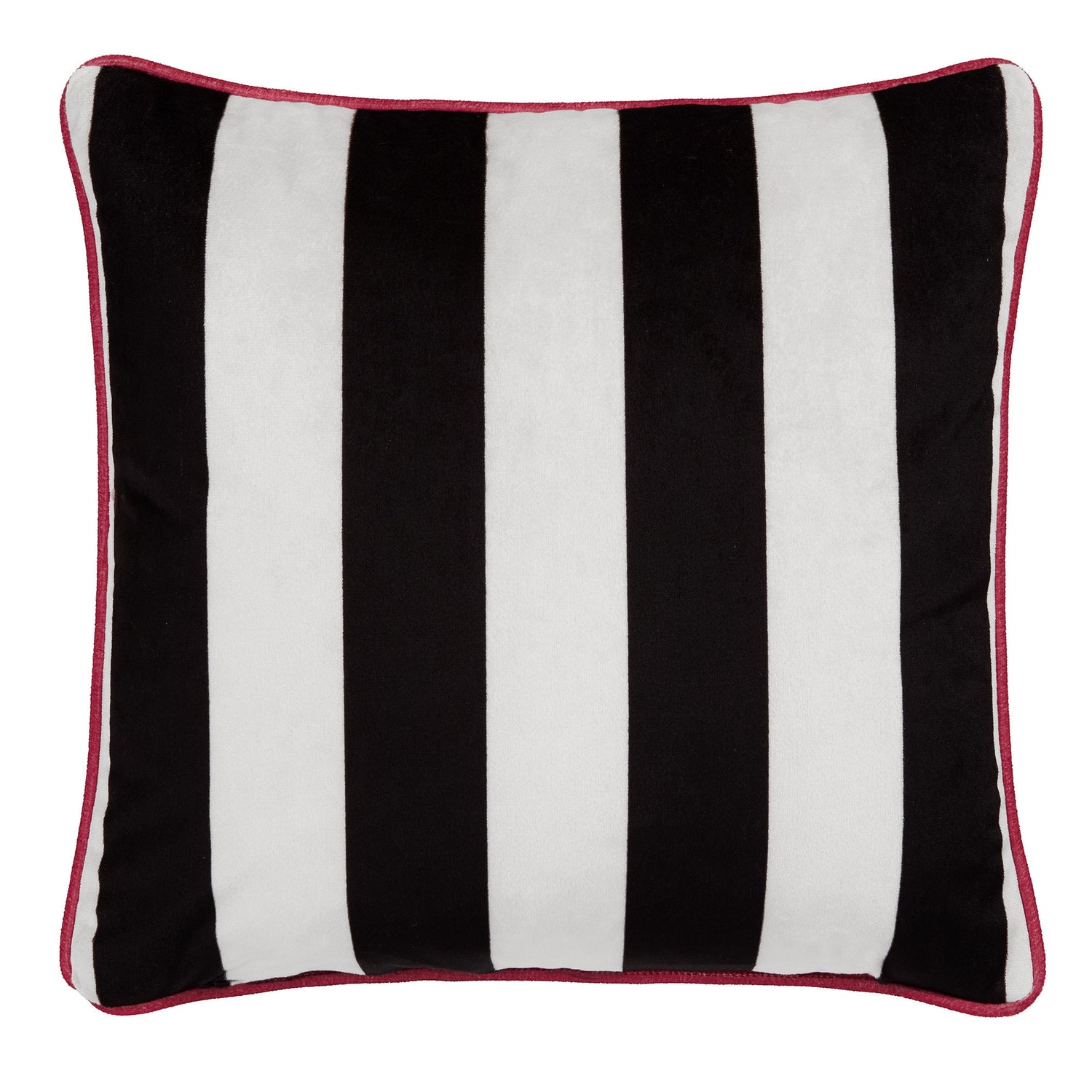 Behold the exquisite Hiyah Hydrangea cushion set by Laurence Llewelyn-Bowen - where luxury meets artistry. Immerse in a tapestry of blue hydrangea blooms on lime green velvet, evoking opulence. Turn to the reverse, enchanted by bold black and white stripes intricately paired with pink piping