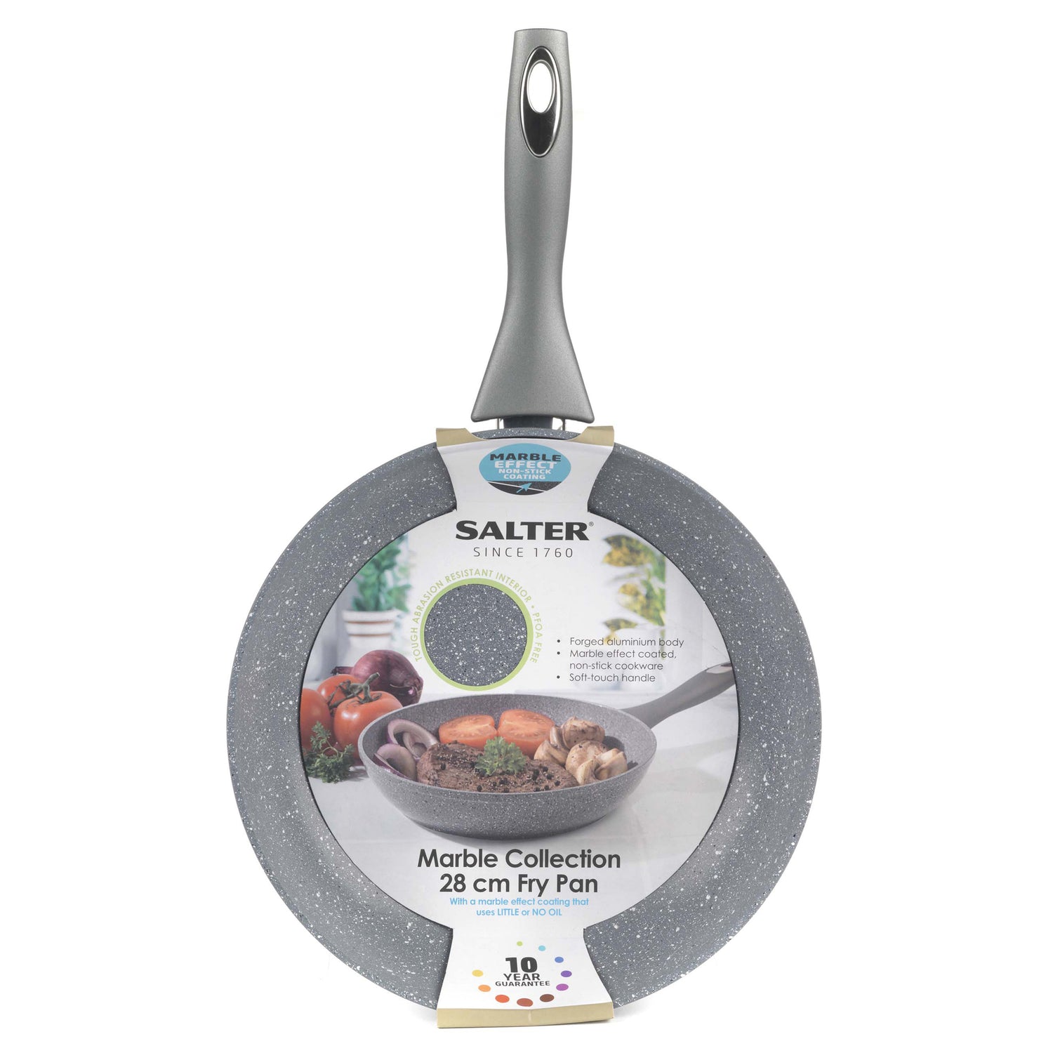 Cook like a professional and show off to your guests with this Salter frying pan, which features a revolutionary new coating so you can cook with little or no oil for gorgeous, healthier food. The grey marble coating ensures that food will easily be released from the pan when cooked, and food debris will slide off for effortless cleaning. In addition to this, it has an induction base, so it is suitable for all hob types, and is even safe to use in the dishwasher for beautifully easy cleaning.