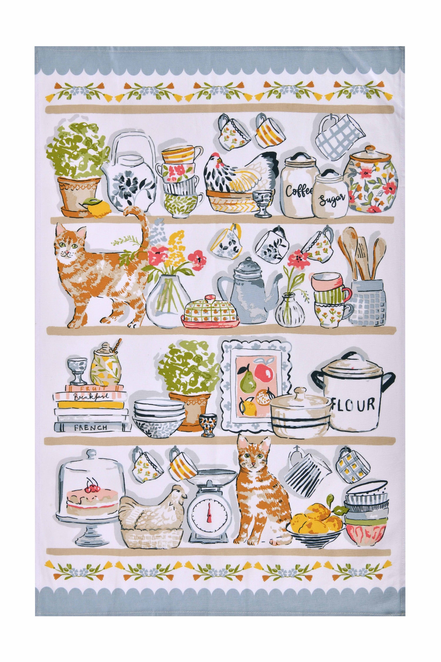 Inspired by a traditional cottage pantry, this design showcases shelves lined with cooking utensils, cookbooks, ceramics, and quirky finds. Playfully incorporating the mischievous nature of cats weaving around countertops, it is hand-painted using watercolours and pen. Gingham and floral borders complete the look, evoking a charming cottagecore aesthetic.